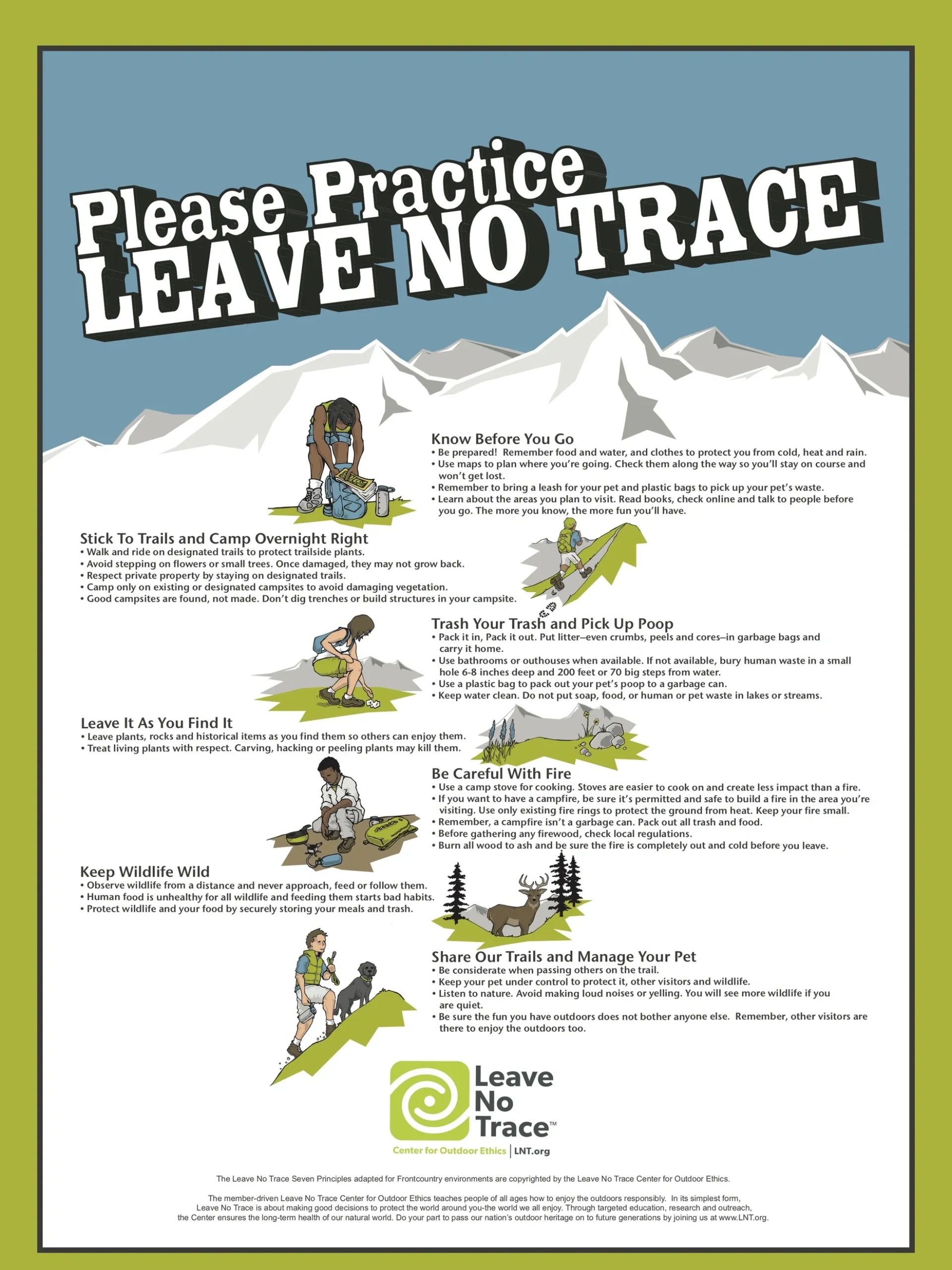 Leave No Trace Camping is the style of camping where you leave the camp grounds just as you found them when you leave the premises. You bring your own water, collect your own trash, provide your own meals, you are 100% self-sufficient and self-sustained during your entire stay! These principles were established by the Leave No Trace Center for Outdoor Ethics, and built on work by the US Forest Service, National Park Service, and Bureau of Land Management in the mid 1980s. The principles are based on and informed by scientific research in the fields of recreation ecology and human dimensions of natural resources.